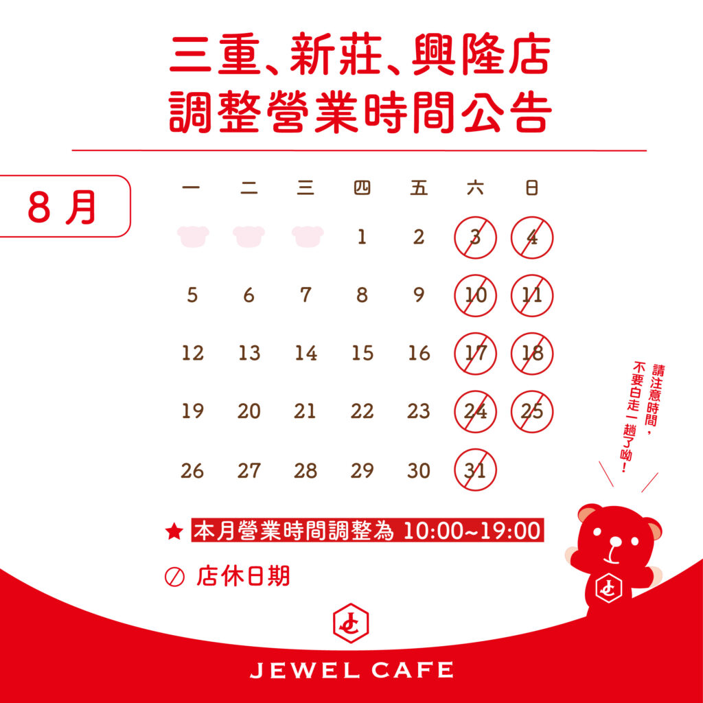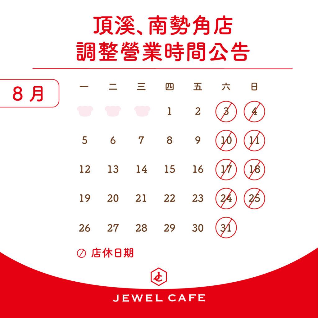 八月份:興隆、南勢角、頂溪、三重、新莊、敦化店六日公休,其他14間門市每天皆有營業,事先與各店鋪預約,或者營業時間直接前往都方便喔。