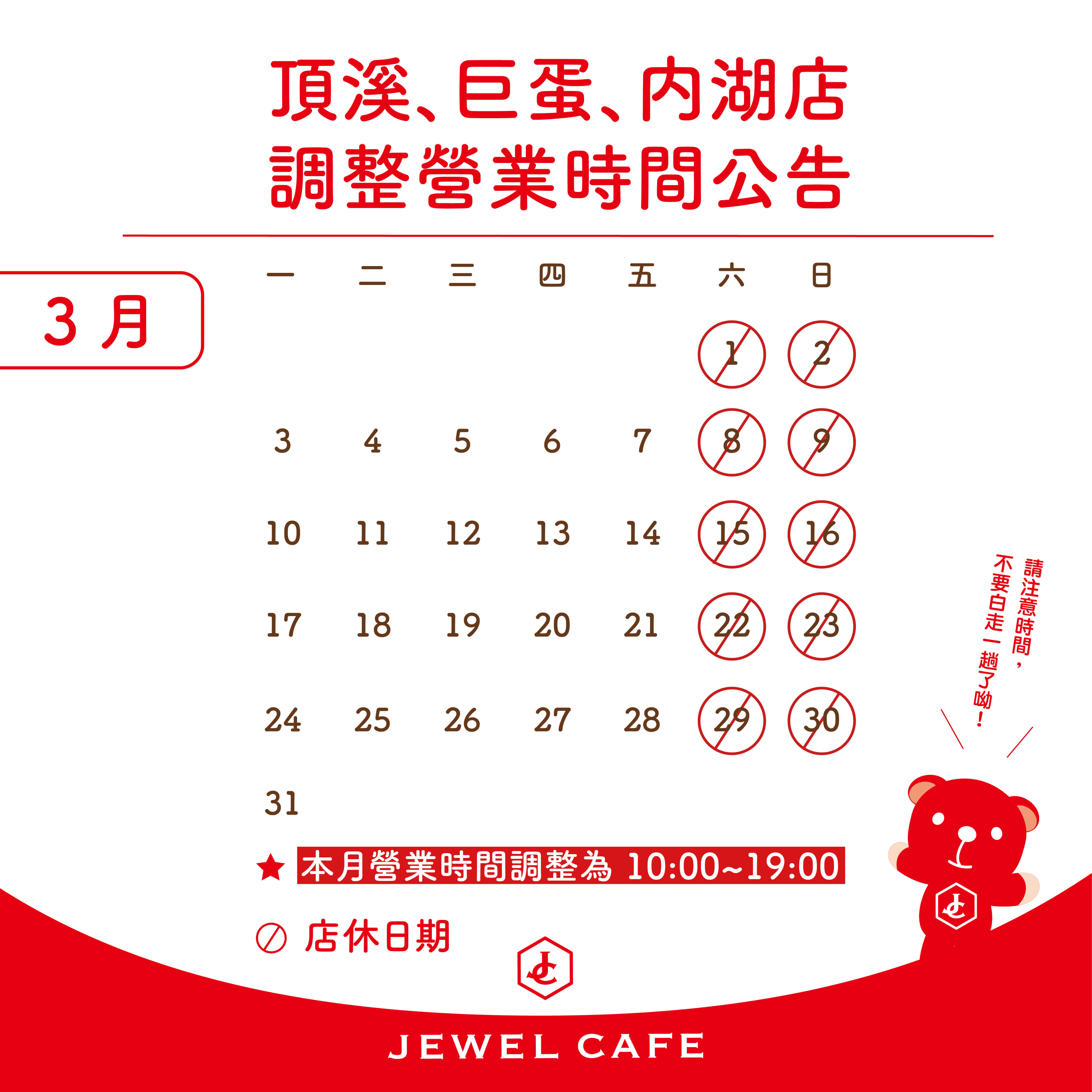 ●頂溪、內湖、巨蛋店營業時間:星期一至五10:00~19:00、六日店休。