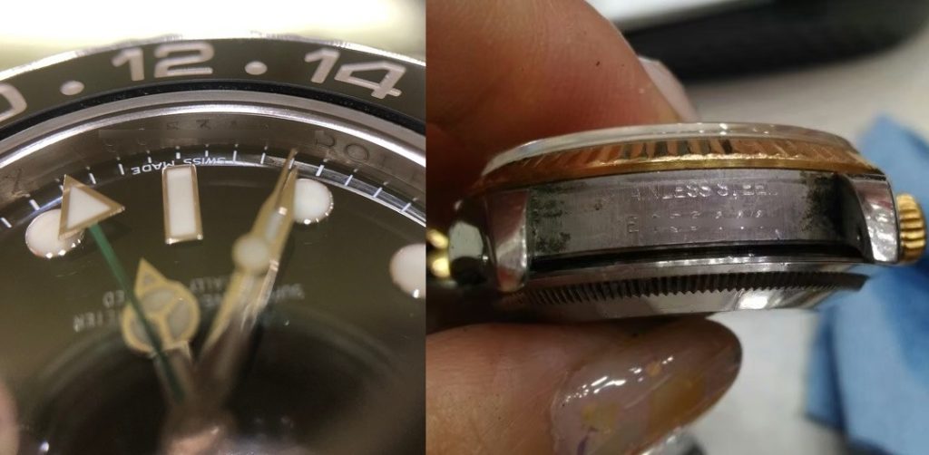 還蠻多零件有一點故障的問題,日期不會動了,風防也是刮傷累累,龍頭也是鎖不緊,手帶也是有點鬆脫,