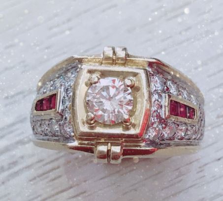 一看戒檯上滿滿的碎鑽+小紅寶 ,標準的早期流行款式,