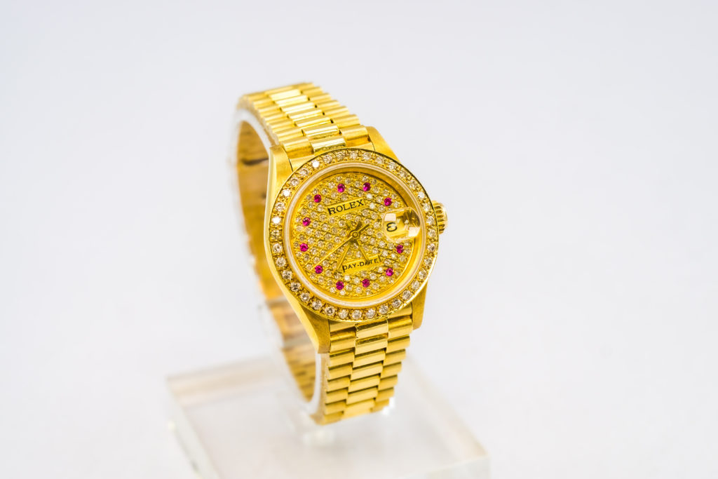 蔡小姐的Day-Date金錶是改過的滿天星,面盤看起來氣勢又華麗,但因為台灣氣候較為潮濕,平常保存不當在無佩戴下,又沒注意已經有受潮的情況、再加上原廠配件部份也遺失了。