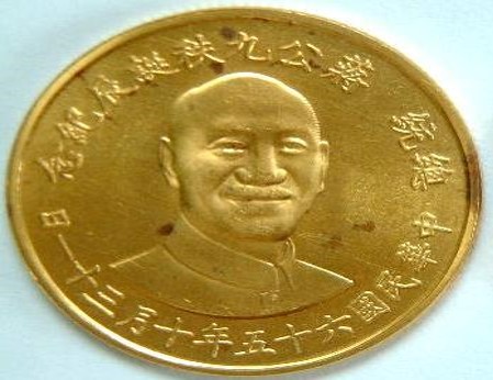 中間為蔣公肖像,周圍鑄刻「總統 蔣公九秩誕辰紀念」、
