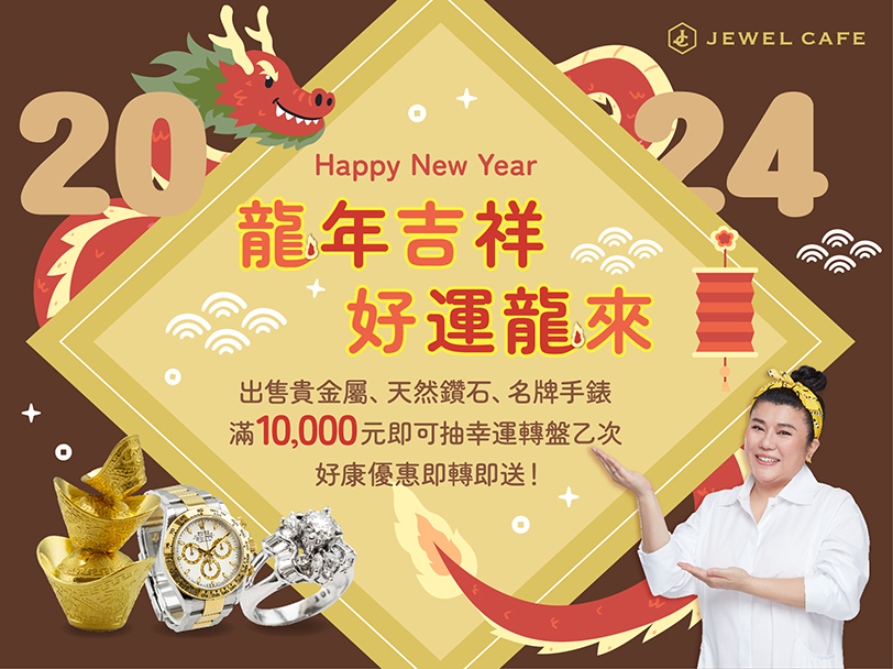 財富、幸福、好運、健康、平安,龍總厚你!見者必將好運來! 2024 新年快樂!龍年行大運!即日起至月底凡出售貴金屬、天然鑽石、高級名牌手錶滿10,000元