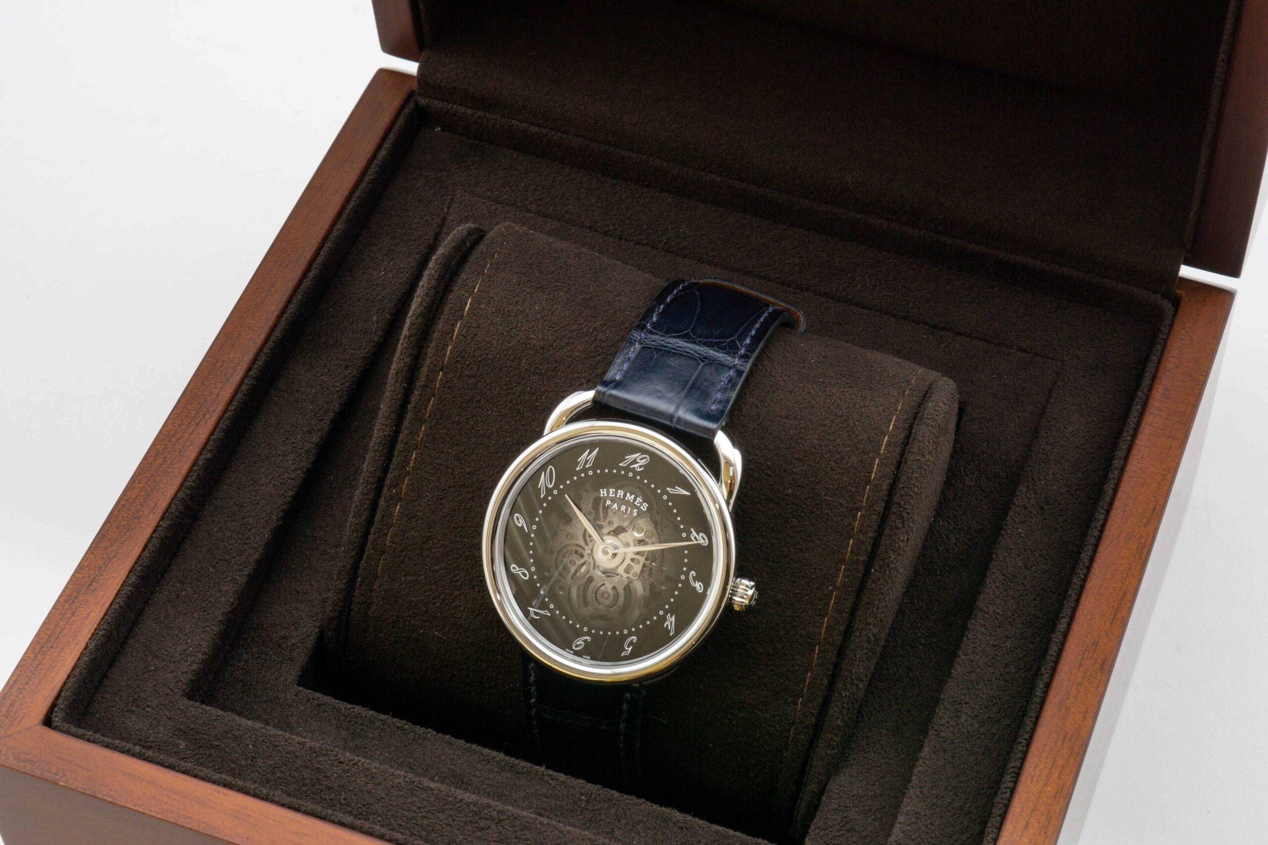 材質 : 316L不鏽鋼材質+鱷魚皮製錶帶今天小編要來介紹的是Hermès 愛馬仕 的Arceau Squelette AR2710 月像腕錶