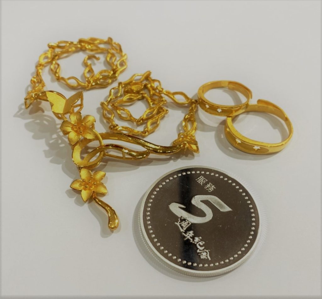 之後他便拿出5年多前久任於科技公司贈送的銀幣及結婚時長輩送的金飾。