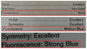 螢光反應 : 在紫外線下會發出特定顏色的光,某些帶有螢光反應的鑽石確實有不好的副作用
