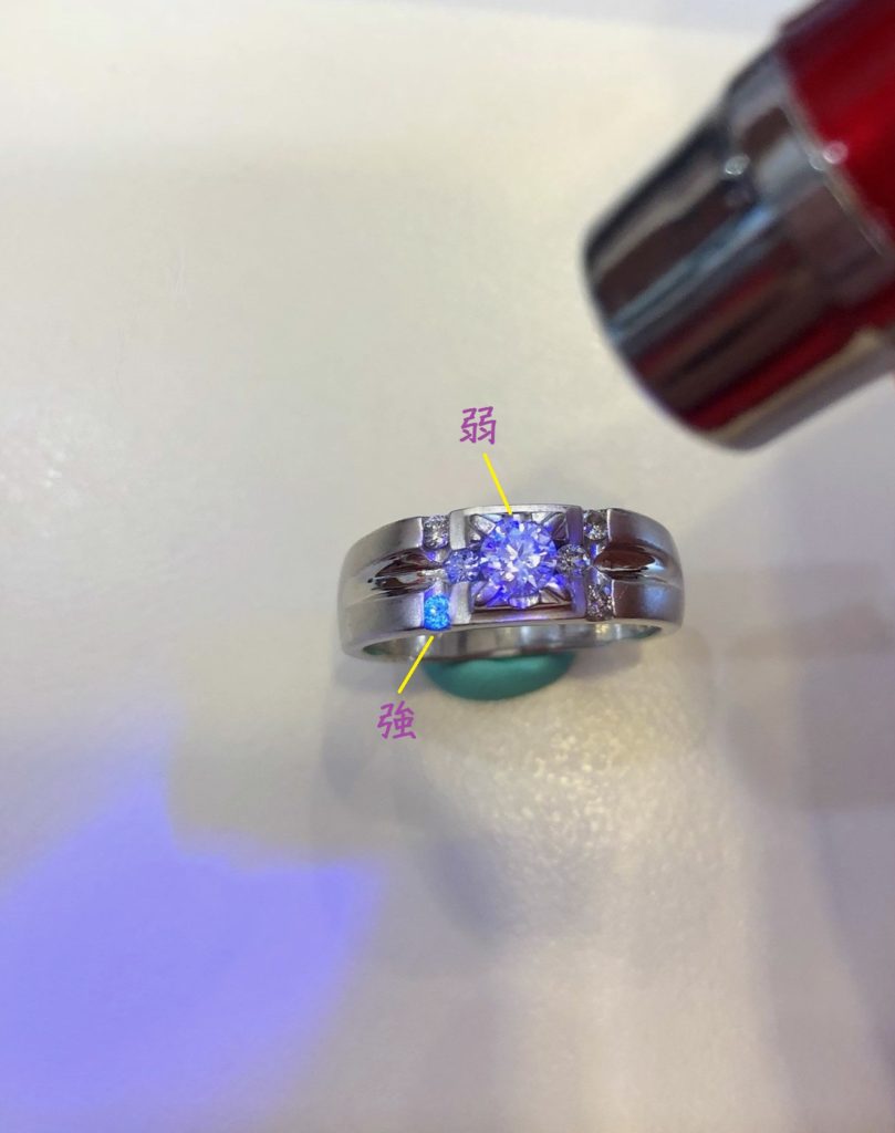 但若有螢光反應的鑽石在紫外燈下,會呈現藍色,