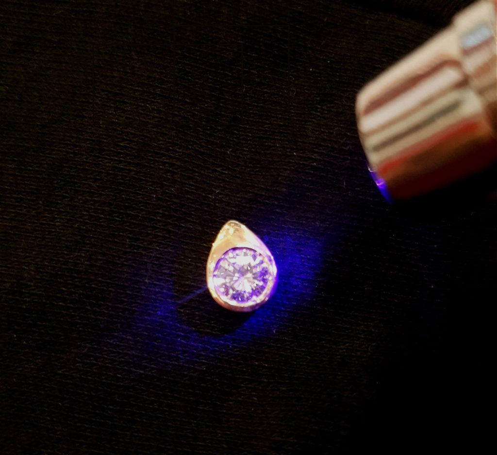 若無螢光反應的鑽石在紫外燈下,並不會變色(如下圖)