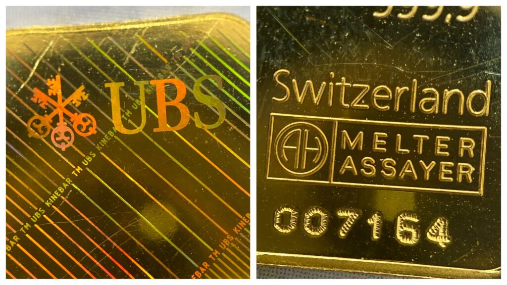 3.『Switzerland』的字樣需要瑞士國家批淮的製造商才可以使用。台銀販售的黃金條塊為瑞士銀行(UBS AG),該行由瑞士銀行(Swiss Bank Corporation, SBC)