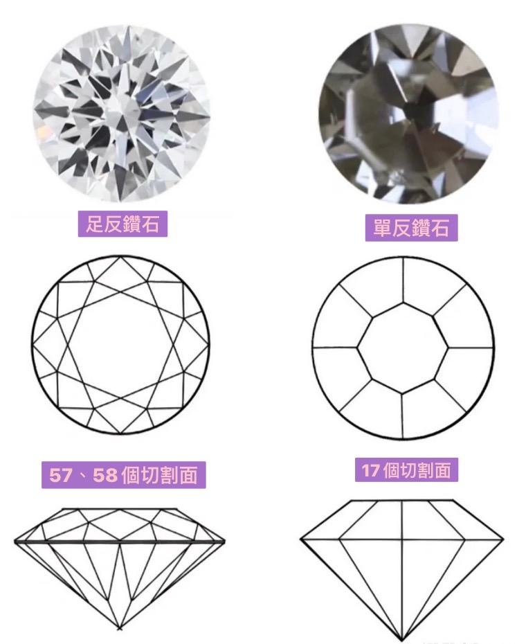 碎鑽根據切割面的數量分為「單反鑽石」和「足反鑽石」。
