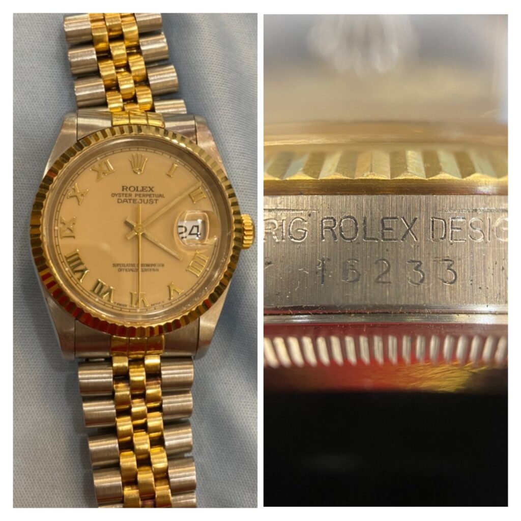 上圖型號16233➡️162代表的就是DATEJUST系列、倒數第二個3代表錶圈是狗牙圈、最後一個3代表材質是18K黃金加精鋼