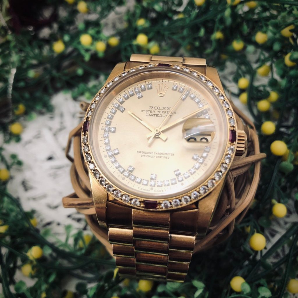 上圖為ROLEX DAY-DATE 型號:18238 少見紅寶石刻度滿圈鑽面盤 在台灣主要是來自以下幾個文化與視覺上的原因: