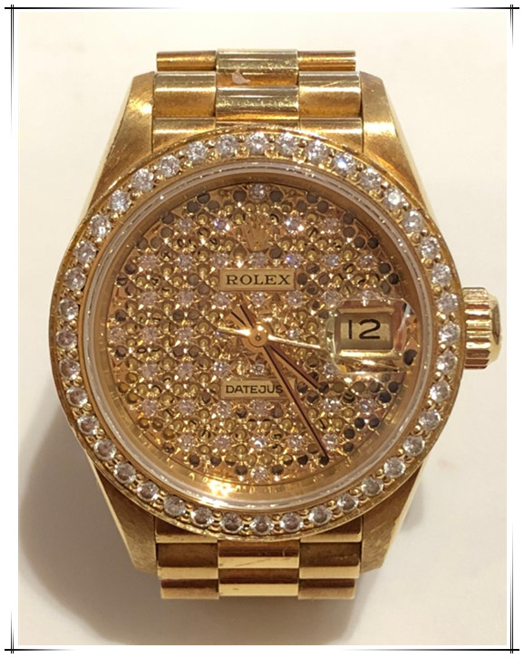 上圖為ROLEX DAY-DATE 型號:18238 金盤鑽圈數字時標 - 「紅蟳」= 土豪味濃、過度華麗的隱喻