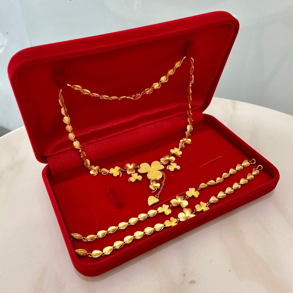 新娘的飾金準備的件數會比較多,例如:項鍊1條、耳環1對、手鍊1對、戒指1只,