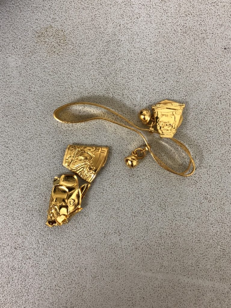 打開發現裡面的金飾都像是被外力擠壓過,部分都看不出原本形狀的樣子,
