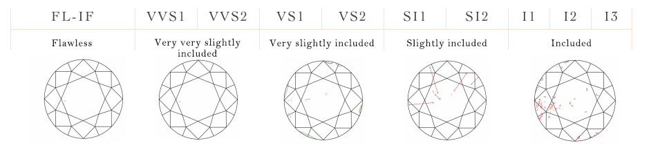 淨度是以鑽石表面特徵(Blemishes)與內部特徵(Inclusions)來評估分級,