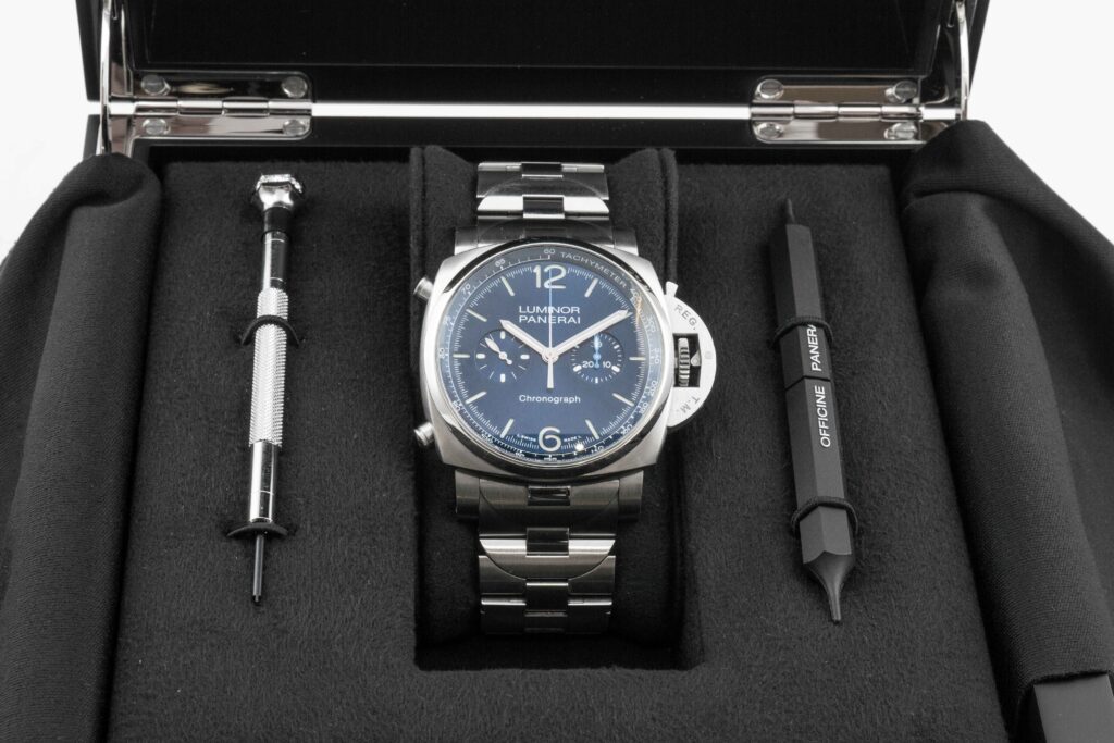 材質為全鋼且這次客人很有誠意的是全配。特別的是這款Panerai Luminor PAM01110 的計時在左邊,