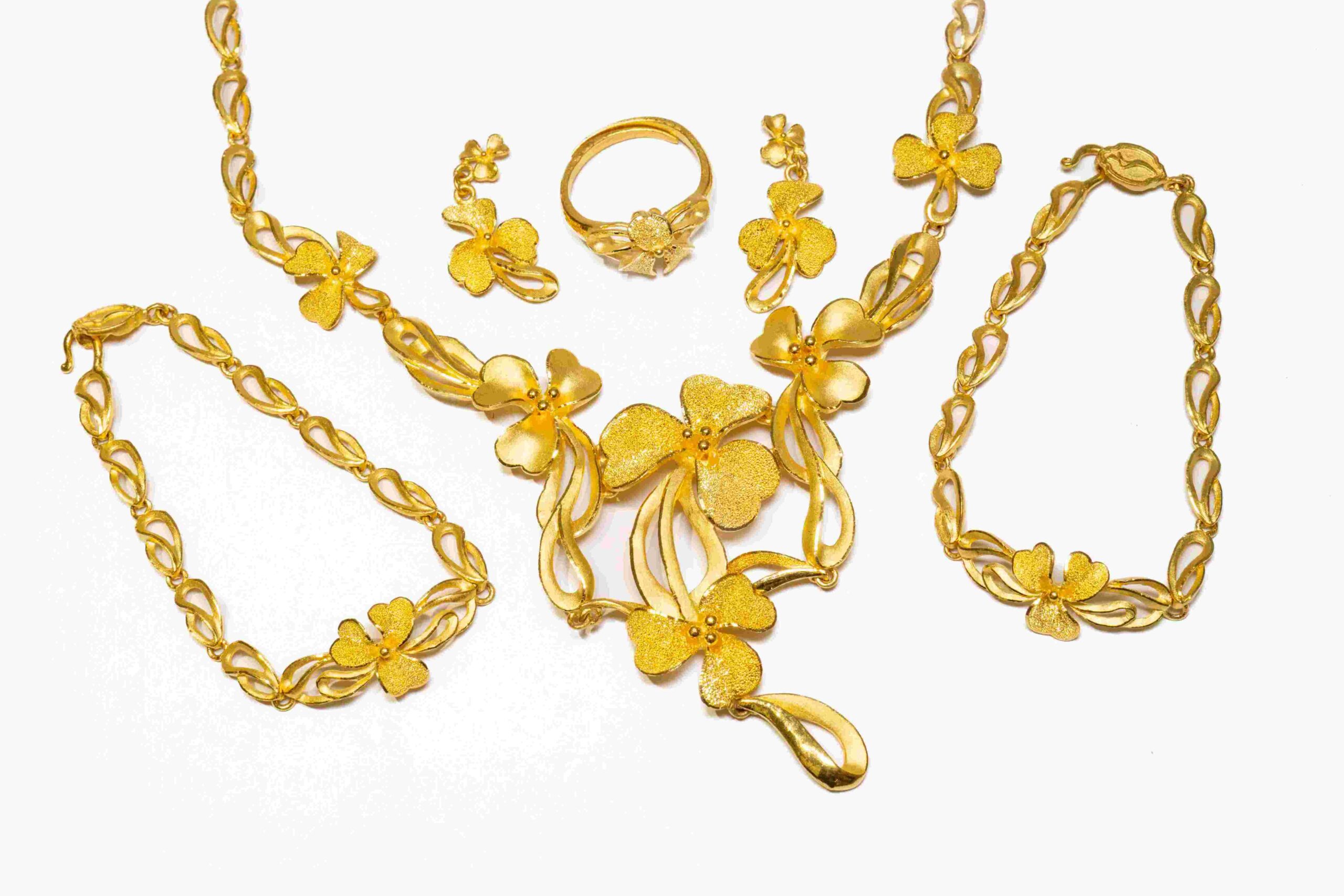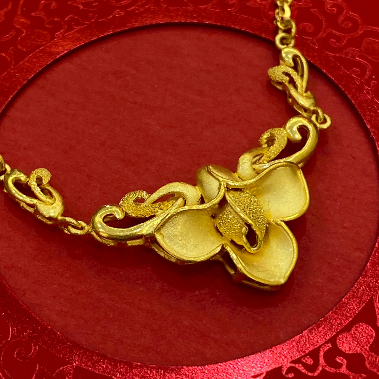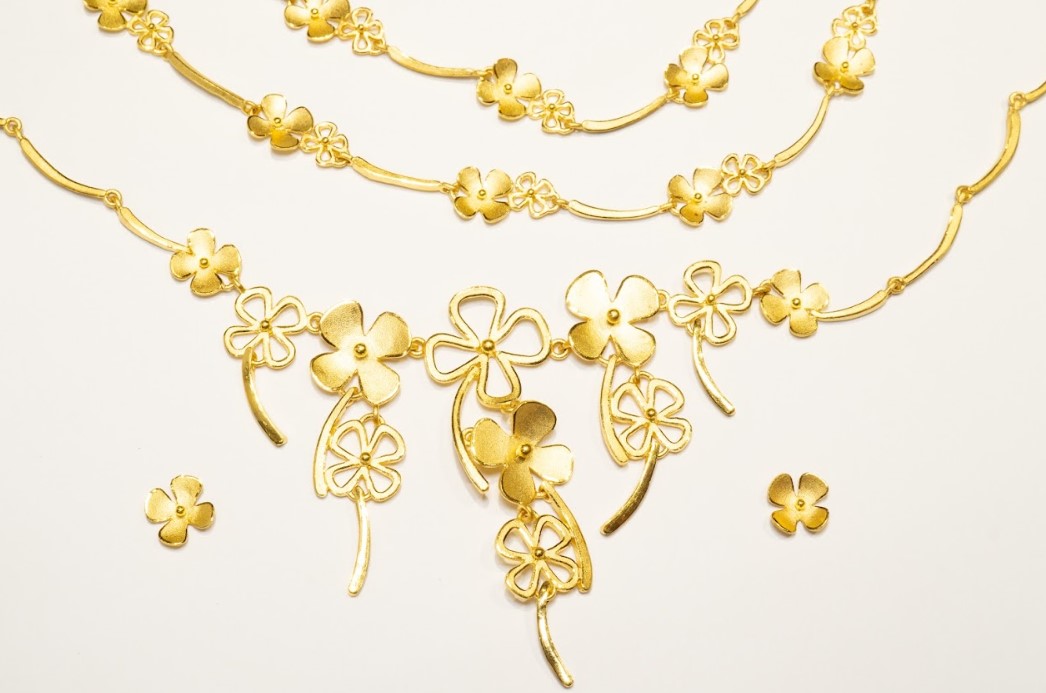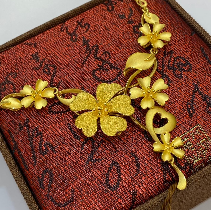 結婚飾金中的項鍊常以華麗的花朵做設計,亮眼的造型搭配新娘禮服非常美麗,但也因為過於繁複的造型,平常很不適合做配戴,因此許多客人都會將用不到的結婚飾金換現金喔!