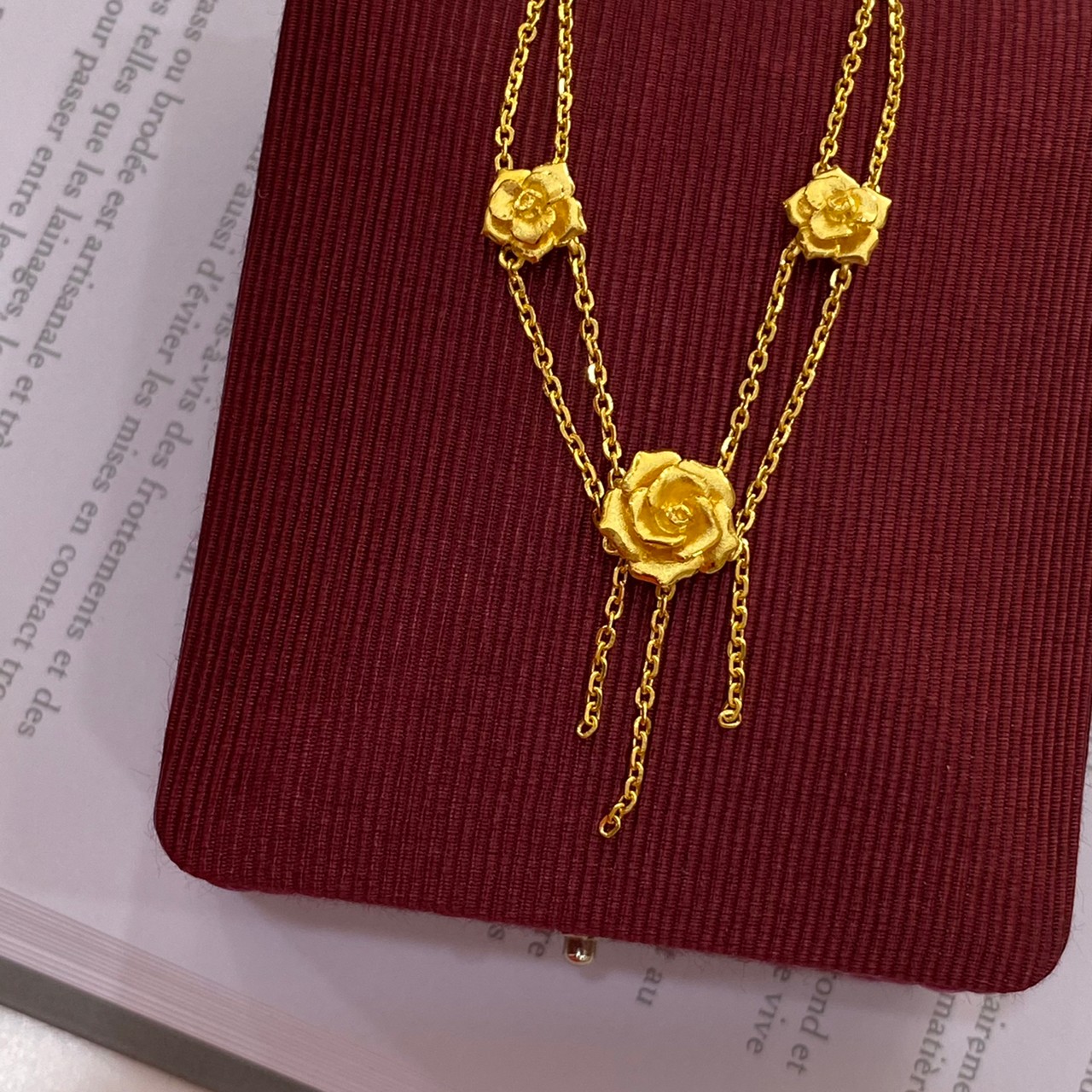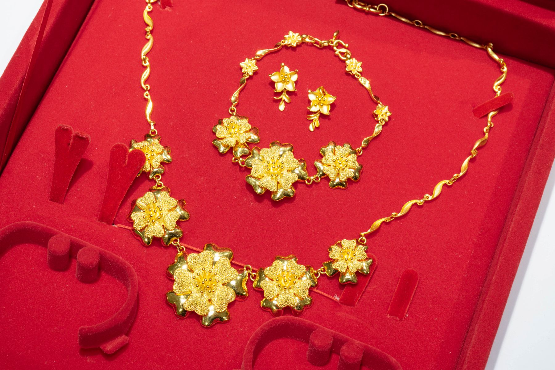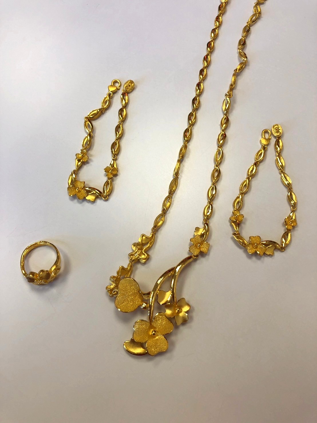 結婚飾金中的項鍊常以華麗的花朵做設計,亮眼的造型搭配新娘禮服非常美麗,但也因為過於繁複的造型,平常很不適合做配戴,因此許多客人都會將用不到的結婚飾金換現金喔!
