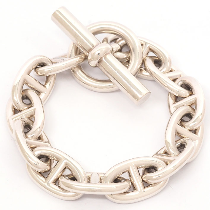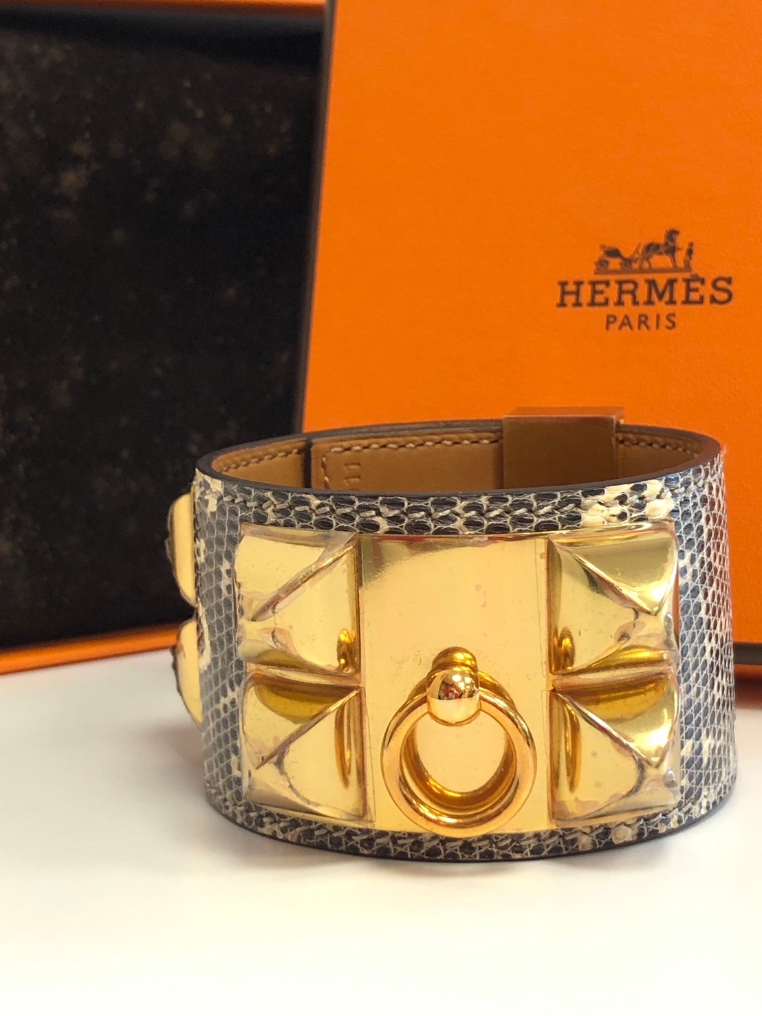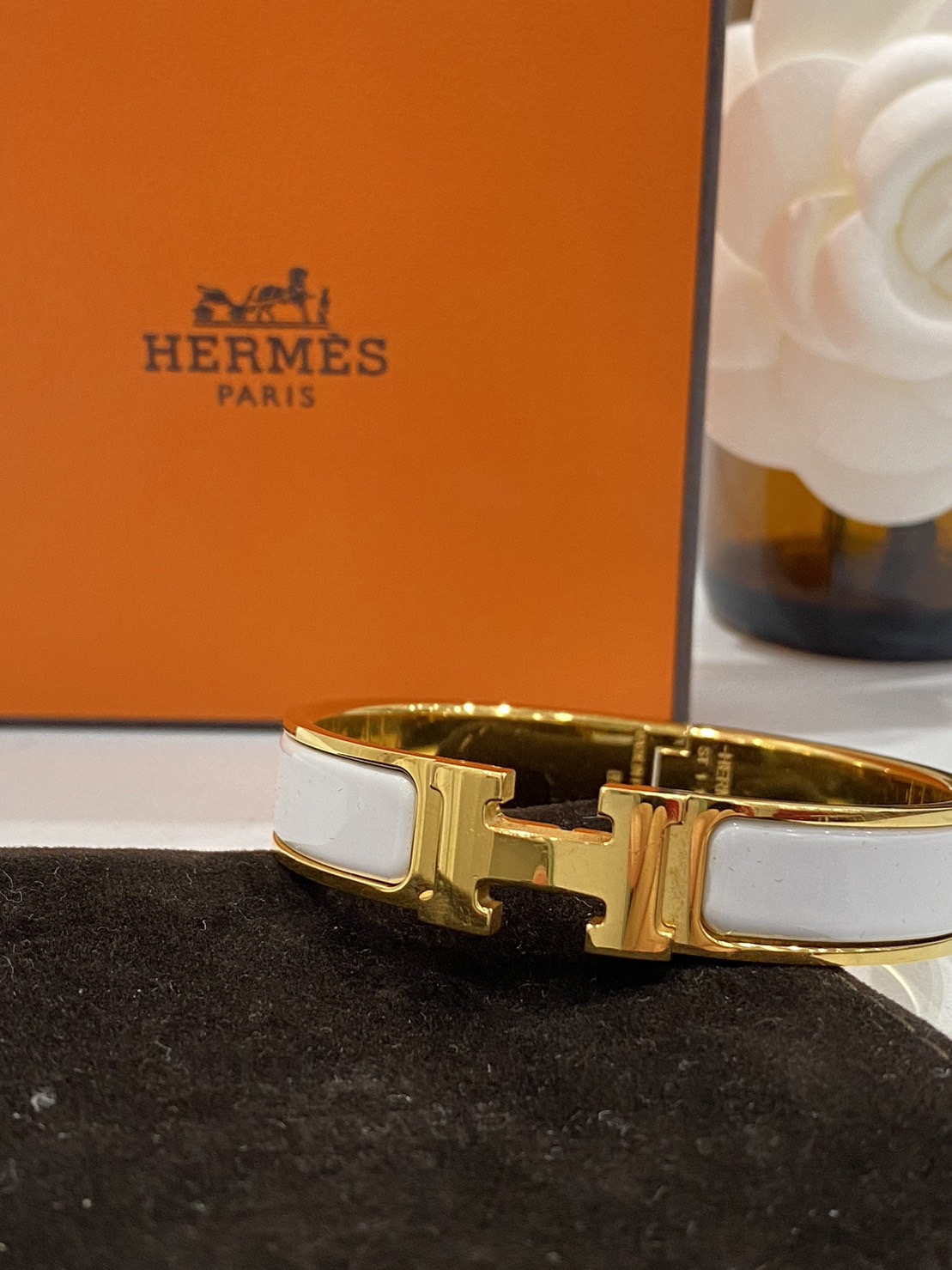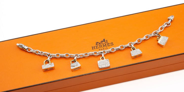 凱莉包的鎖頭可以說是愛馬仕包的代名詞,而此款手環就是以凱莉包的經典鎖頭而設計出的一款手環。正因是一向是選用上等皮革做為包包素材的愛馬仕,因此在手環製作時也會運用不同素材的特性衍生出各種不同的設計。結合具份量的皮革素材以及銀或貴金屬的金屬手環,在灑脫悠閒中也承襲了愛馬仕一貫的高尚優雅風格。